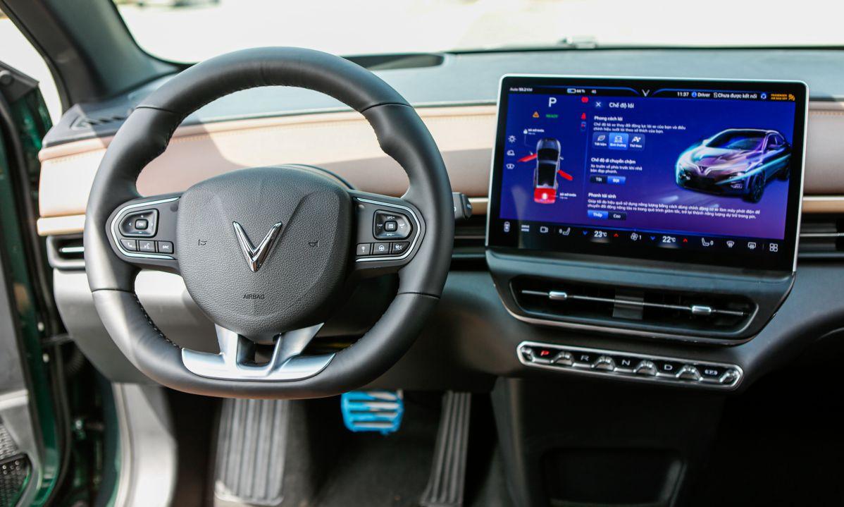 Vô-lăng 3 chấu thiết kế dạng D-cut thể thao, được nhấn nhá bởi các chi tiết mạ bạc, mang đến cảm giác sang trọng cho mẫu SUV điện phổ thông. Trên tay lái tích hợp các nút bấm chức năng tiện lợi.