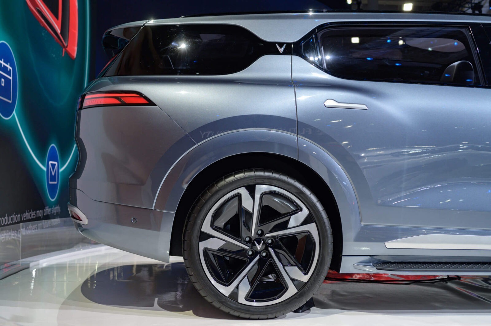 Bộ la-zăng đa chấu tạo hình bắt mắt, kích thước lớn (20-21 inch) là một trong những điểm tạo sức hút đặc biệt cho VinFast VF9 khi nhìn ngang. Tay nắm cửa thiết kế dạng ẩn hiện đại.